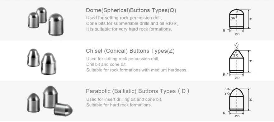 У Grand Sea есть множество типов твердосплавных пуговиц, таких как сферические пуговицы, баллистические пуговицы, конические пуговицы, клиновые пуговицы, долото с клиновидным гребнем, кончик крыла, пуговицы-ложки, пуговицы с плоским верхом, зубчатые пуговицы, острый коготь, наконечники шнека, дорожные пуговицы. кнопки копания и так далее.